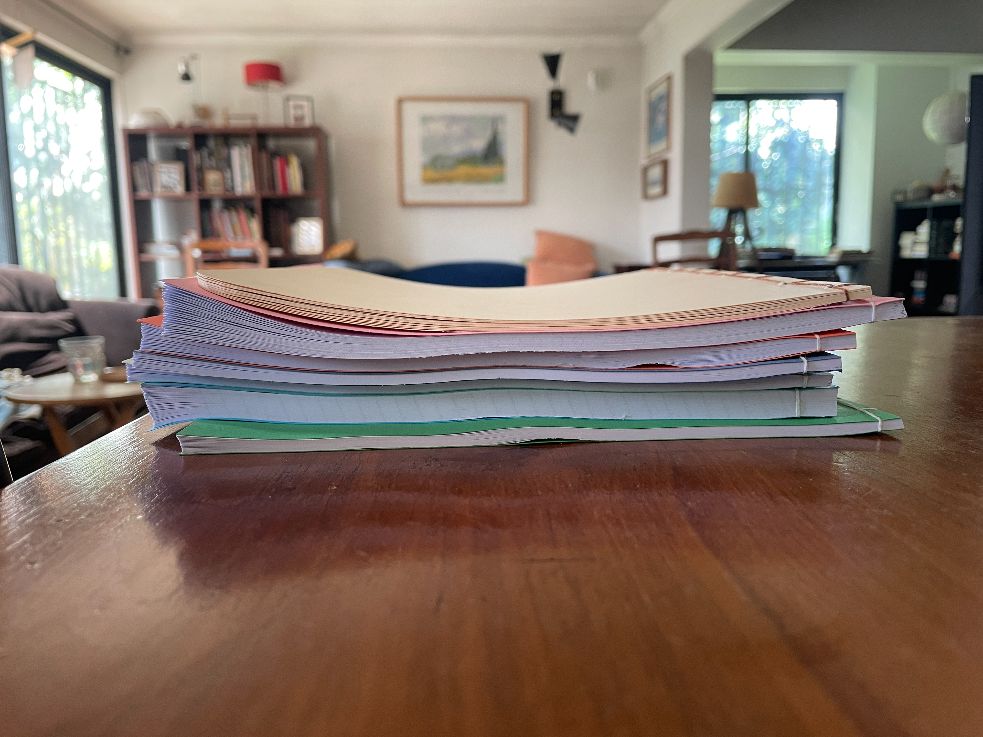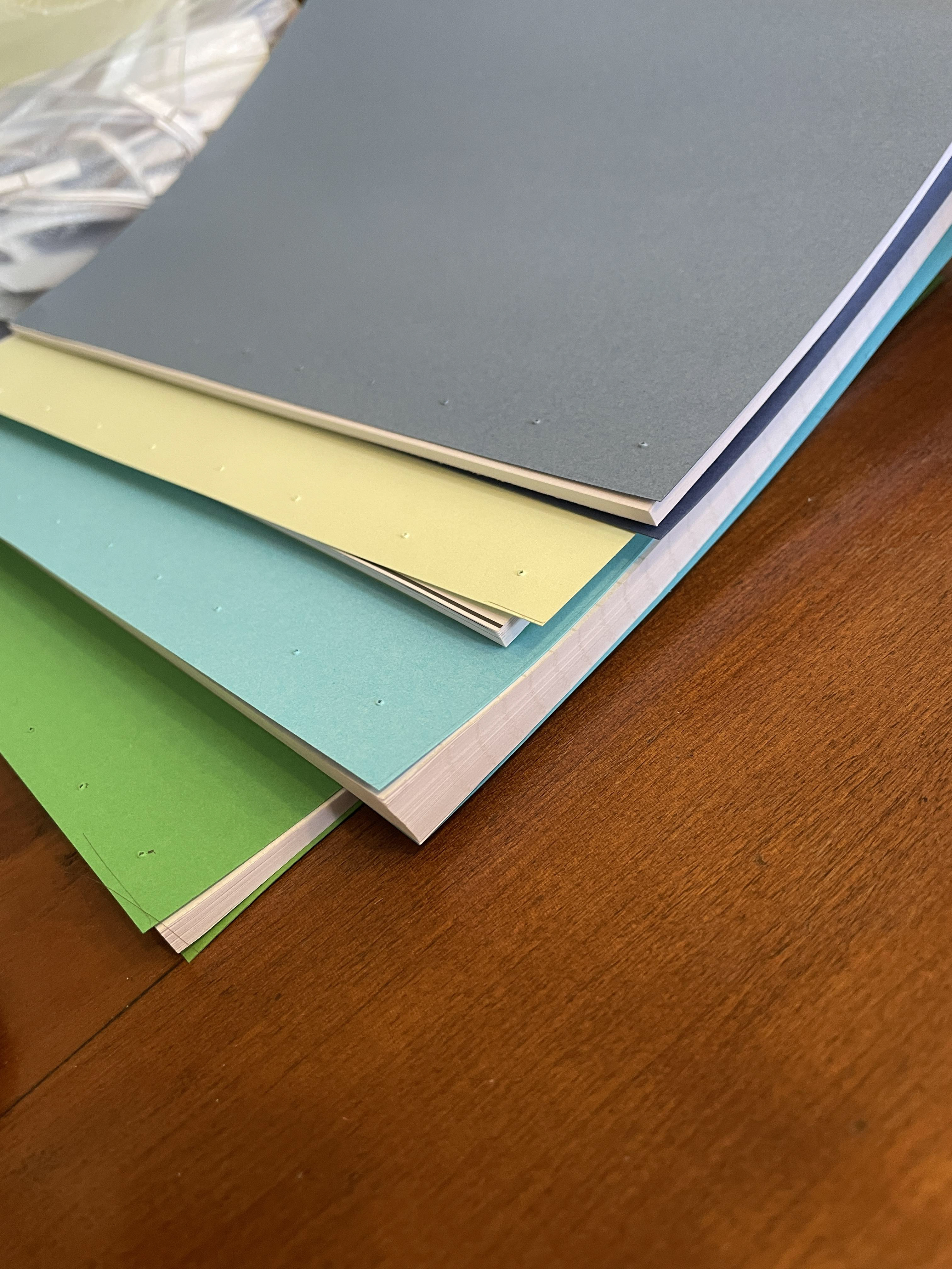 miércoles 9 de octubre, 2024 - he estado trabajando en mis proyectos con más flexibilidad que normal, tal vez por la primavera, tal vez por mi cumpleaños, tal vez porque no son mi única responsabilidad, no sé. está bien eso sí, disfruto y de todas formas trabajo en otras cosas, vivo la vida. en esta última semana y media me dediqué (aparte de avanzar en los detalles estructurales para el proyecto de achibueno, que van viento en popa) a cortar los papeles que imprimí, escoger colores, encuadernar, volver a cortar pero con la guillotina, comprar más papeles, y encuadernar más. y cortar.