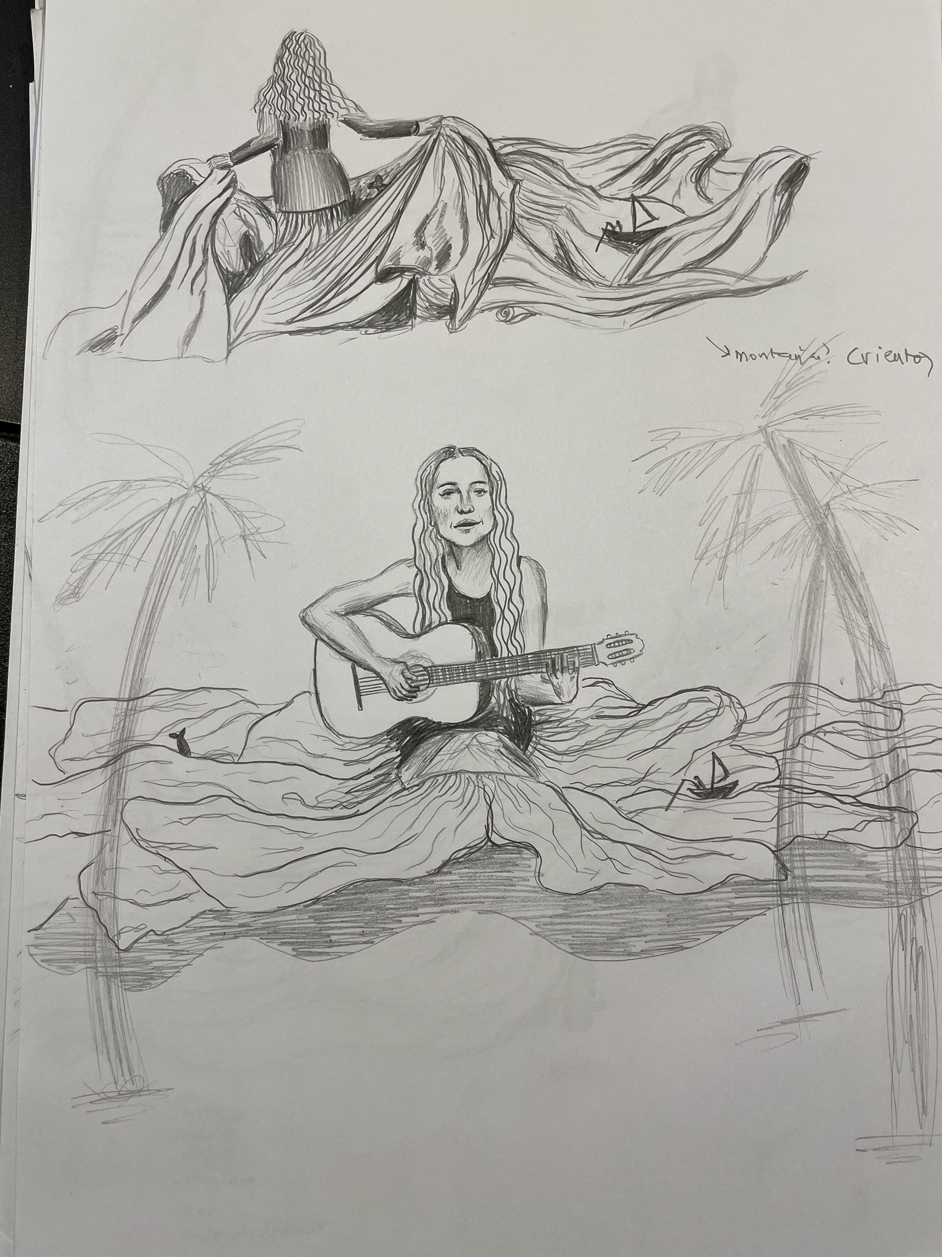 Como había ilustrado canciones de la nueva canción como parte de mi proceso, y como veo el trabajo de natalia tan relacionado a toda esa música, me surgió la necesidad de ilustrar las canciones. la música para mí está muy llena de imágenes, toda la poesía. Son imágenes surreales, que en general (en la música que suelo escuchar) contienen personas, elementos de la naturaleza, y música. así salieron las ilustraciones para estas canciones, con estos tres grupos.