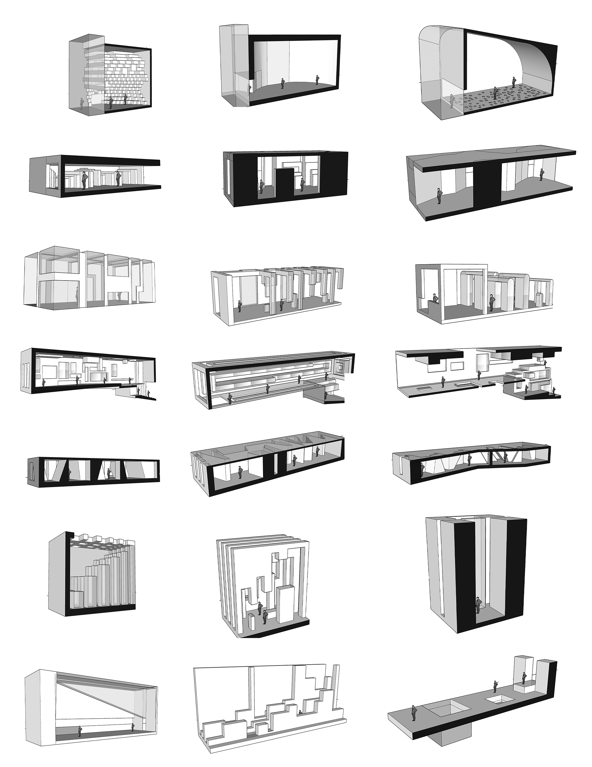 Estas relaciones (entre las etapas de la historia y los distintos sentimientos) fueron formadas a través de la experimentación material con pequeñas maquetas. Cada maqueta representó un sentimiento a través de las cualidades espaciales listadas, y como un puzzle fueron presentadas a distintas personas para ver cómo se relacionan entre ellas, qué evocaba cada maqueta, y qué historia cuenta la combinación final de maquetas.