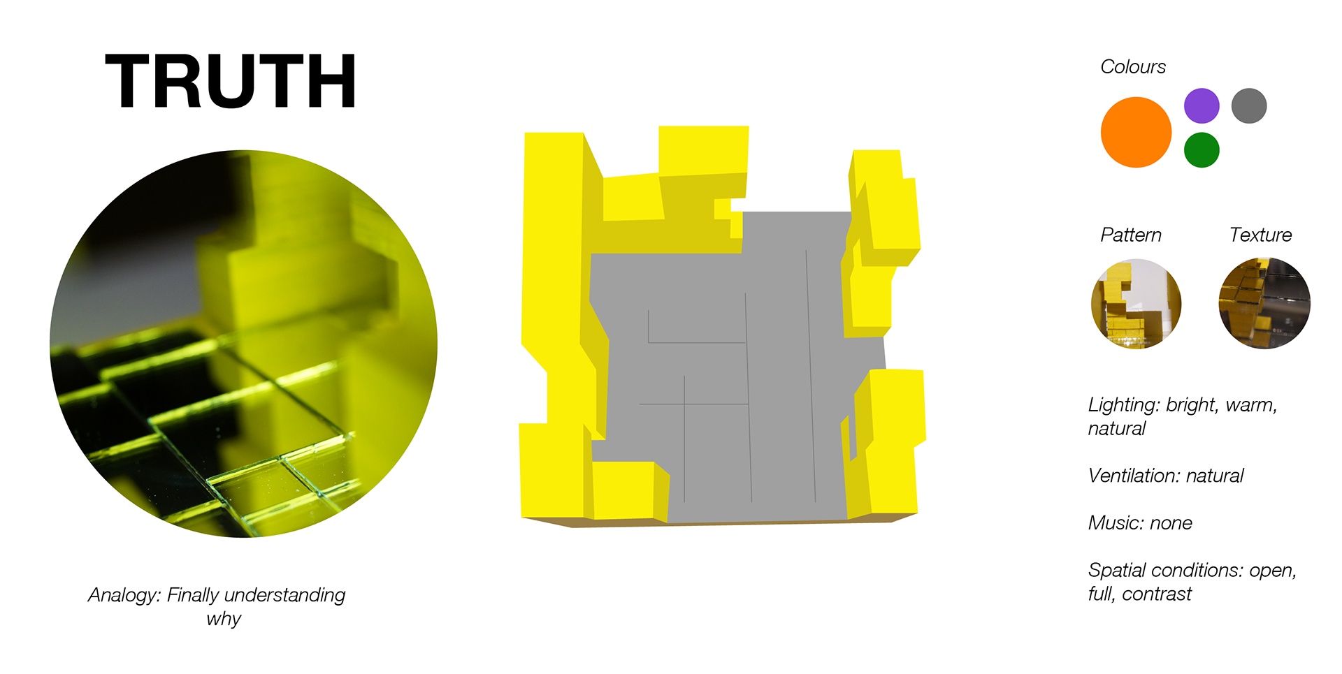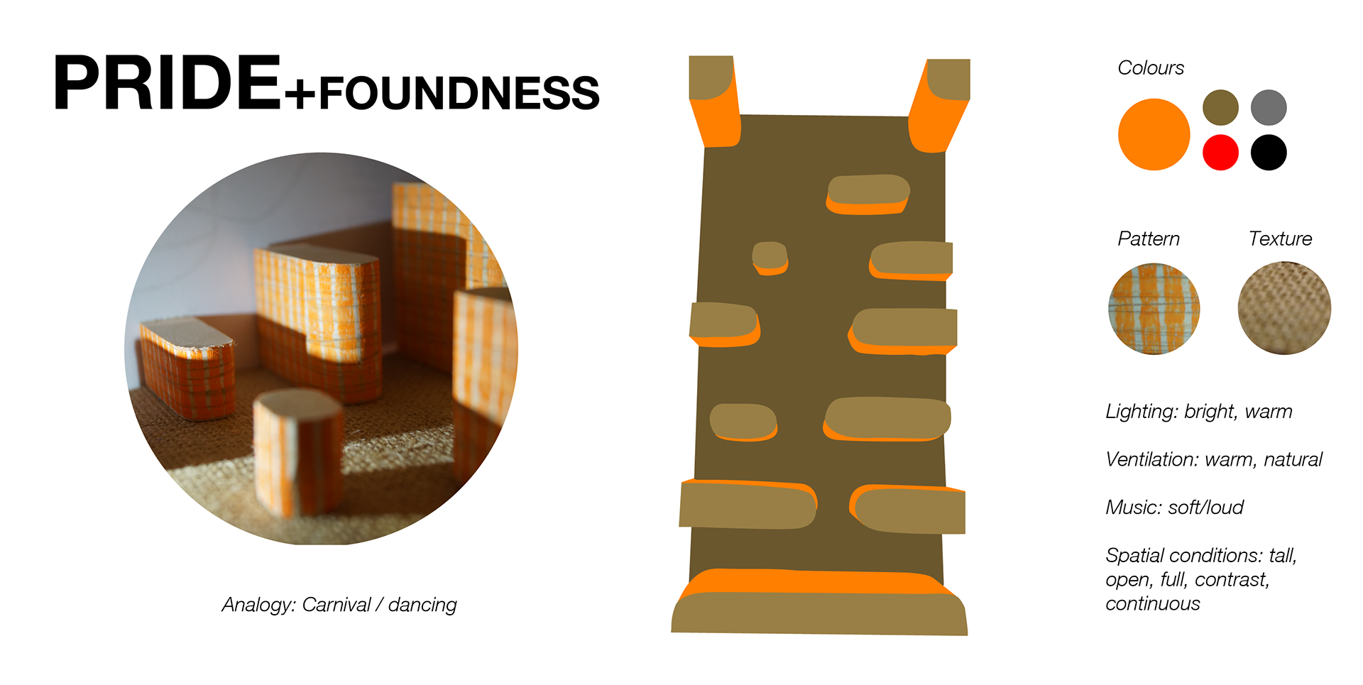 Para contar la historia, la arquitectura fue el lienzo. para eso, cada etapa de la historia fue relacionada a un sentimiento, y esos sentimientos dictaron la calidad espacial: textura, espacio, luz, forma, y el ambiente en general.