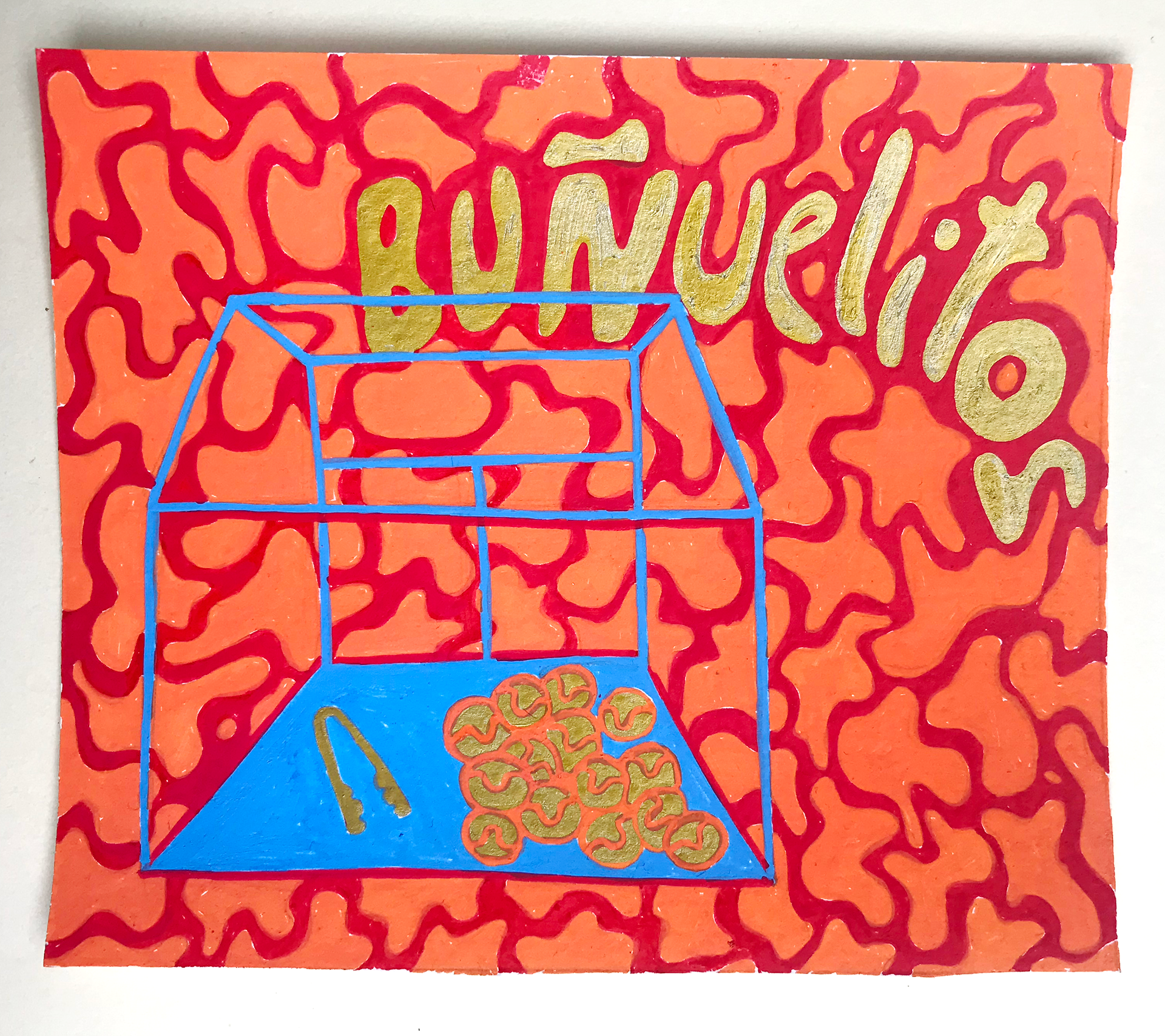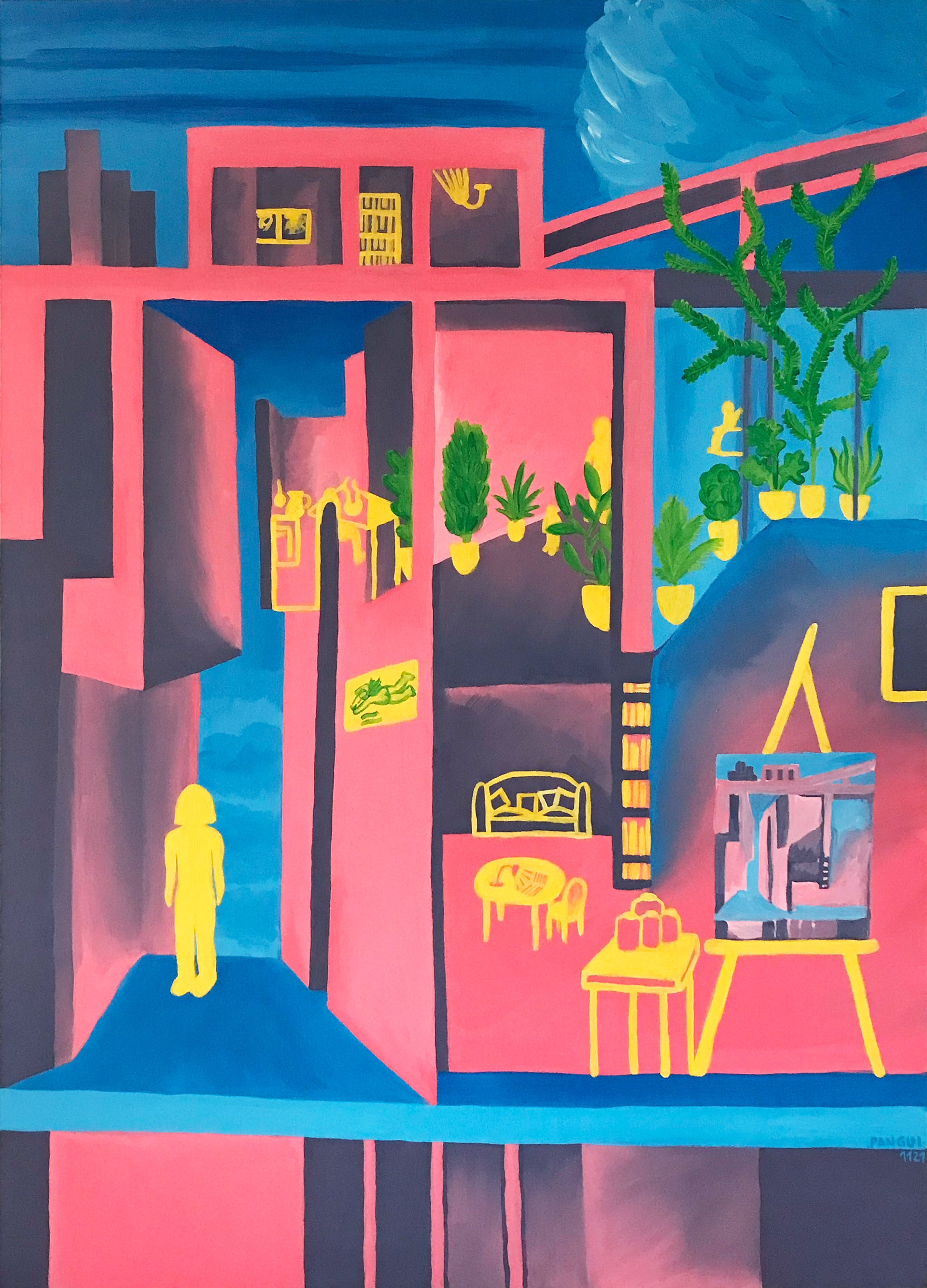 Como lo relatado en los proyectos de retratos, muchas pinturas terminan siendo formas de representar a alguien. Los últimos dos cuadros (en la parte superior) son representaciones de mi cerebro y el cerebro de mi madre como espacios arquitectónicos. En su propia manera, son retratos - retratos interiores que quiero seguir explorando. Otras temáticas que me gusta observar y "retratar" son elementos culturales, también experimentar con la miniaturización(Quitito Azul) o maximalización, como la pintura que dio nacimiento al proyecto de La Vulva.