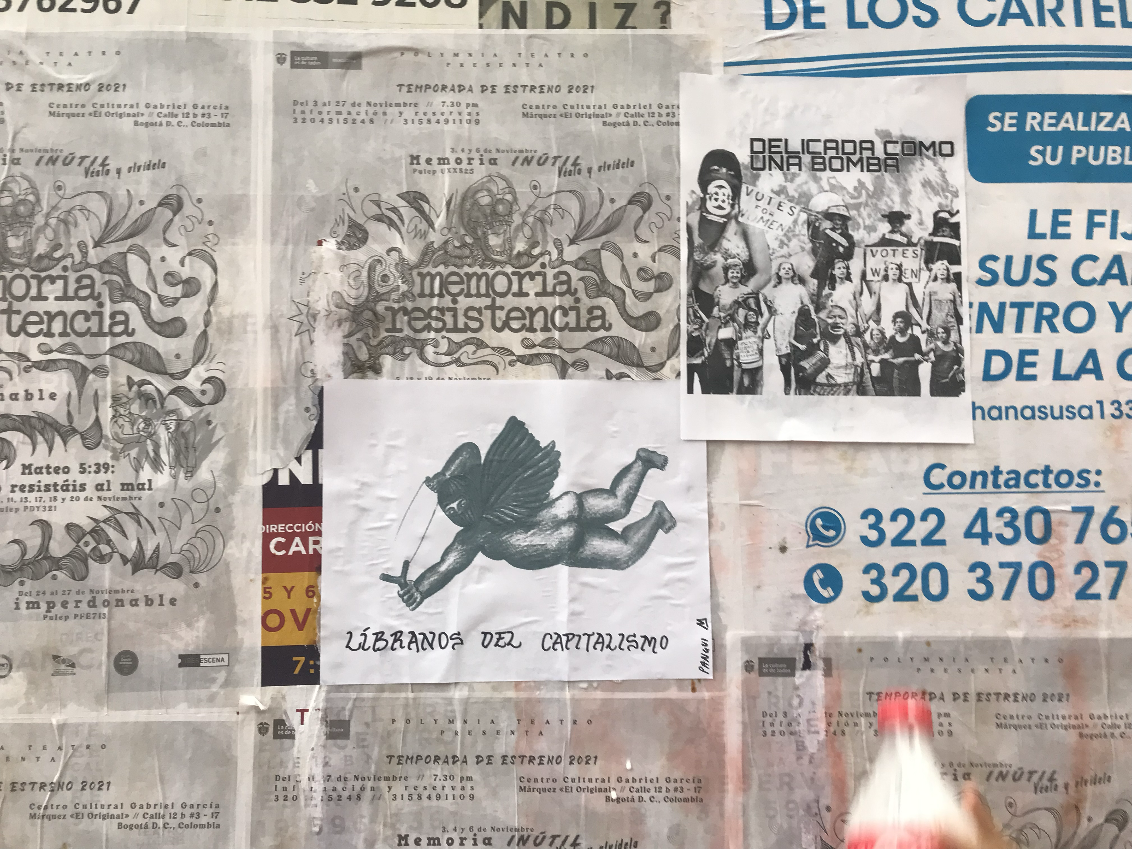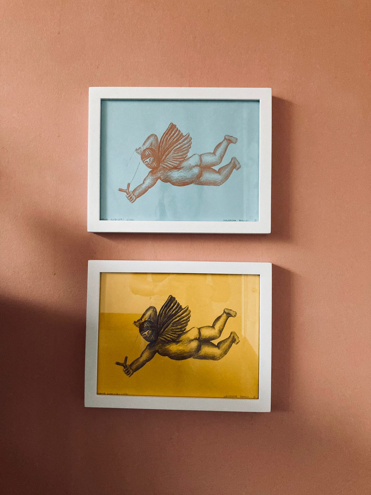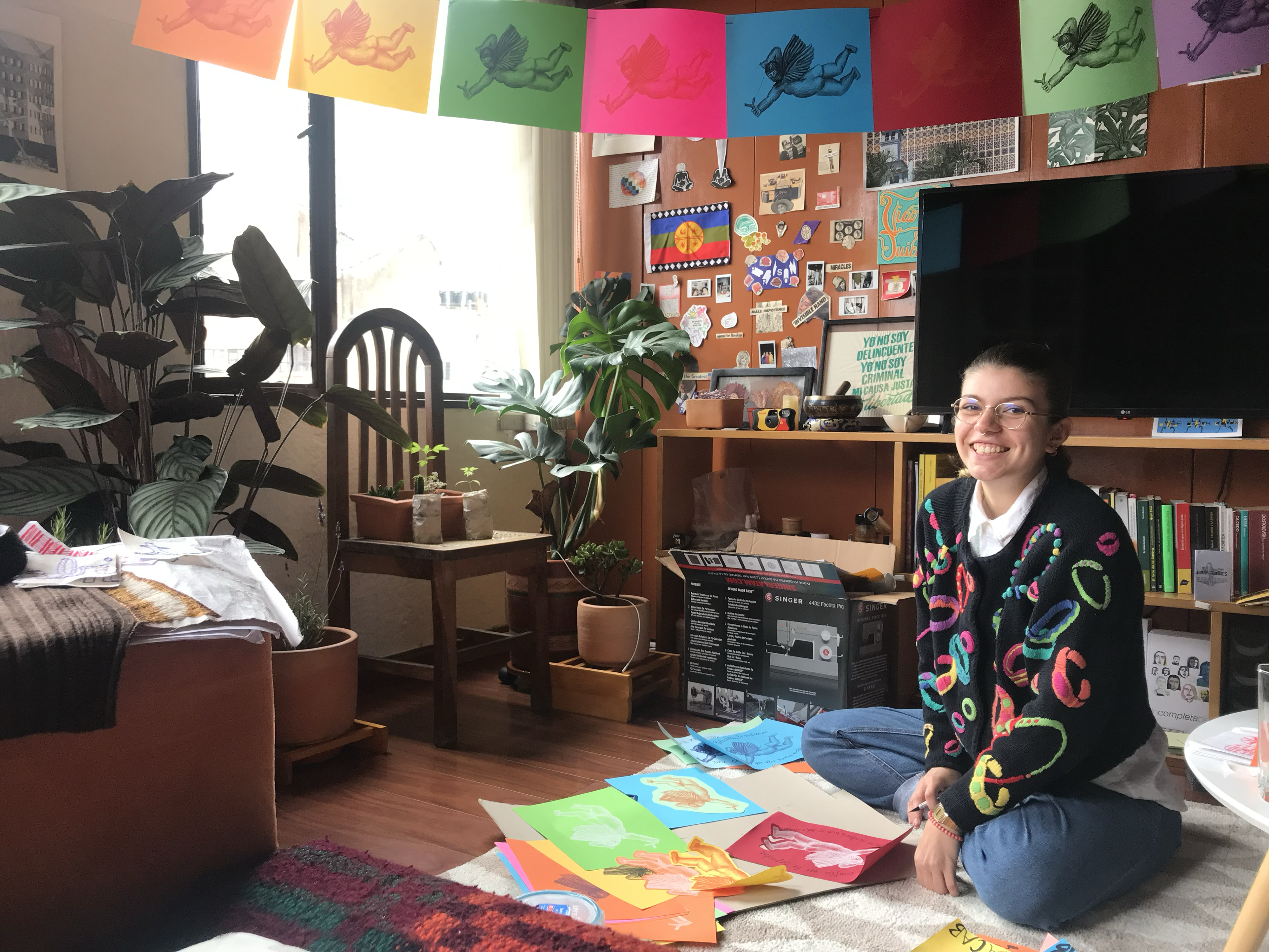 El año 2021 surgieron decenas de ángeles capuchos de todos los colores a través de la serigrafía. En parte fueron pegados en el centro de Bogotá, Colombia, otros fueron comercializados, y con la otra parte hice una guirnalda de angelitos.