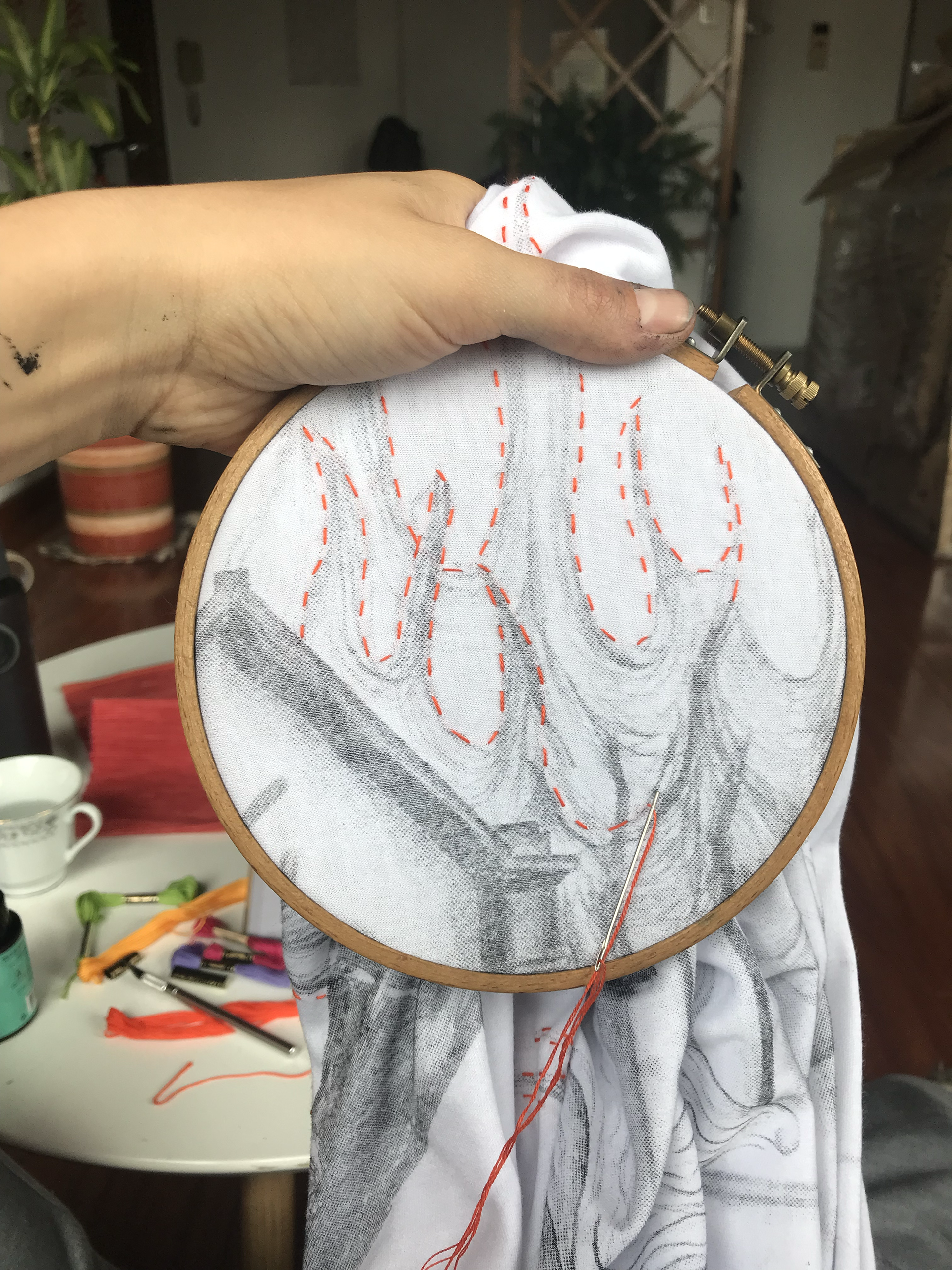 From there, and through digital hatching, it migrated into screenprinting over a piece of cloth, which I then intervened through embroidery. It had the shape of a dome, making it a temple to the street. It was shown for progress made in the masters thesis project in december of 2021, on the university's grounds.